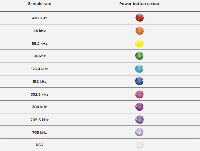 Mojo 2, çalan parçanın kalitesini size bildirmek için güç düğmesini kullanır. Yukarıdaki görseli referans alarak, ışığın rengine göre müziğin DSD/PCM formatını ve örnekleme frekansını anlık olarak takip edebilirsiniz.
